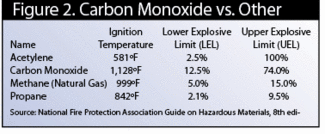 在多层住宅的较低楼层发生的火灾可能会将热量和烟雾扩散到整个火灾建筑。这些烟会被困在阁楼里,也就是顶层天花板和屋顶之间的空间。被派去检查是否延长的成员会拉起天花板,让氧气进入阁楼,热气体会与空气混合,阁楼会回风。这是怎么发生的?根据我们今天对一氧化碳(CO)的了解,这个空间可能充满了一氧化碳。记住,除了其他危险特性,一氧化碳也是易燃的。图2将CO与一些常见的可燃气体进行了比较。这对我们消防员来说意味着什么?一氧化碳会在一个相对较低的温度下燃烧(无论如何用于火灾),几乎在任何混合物中燃烧。