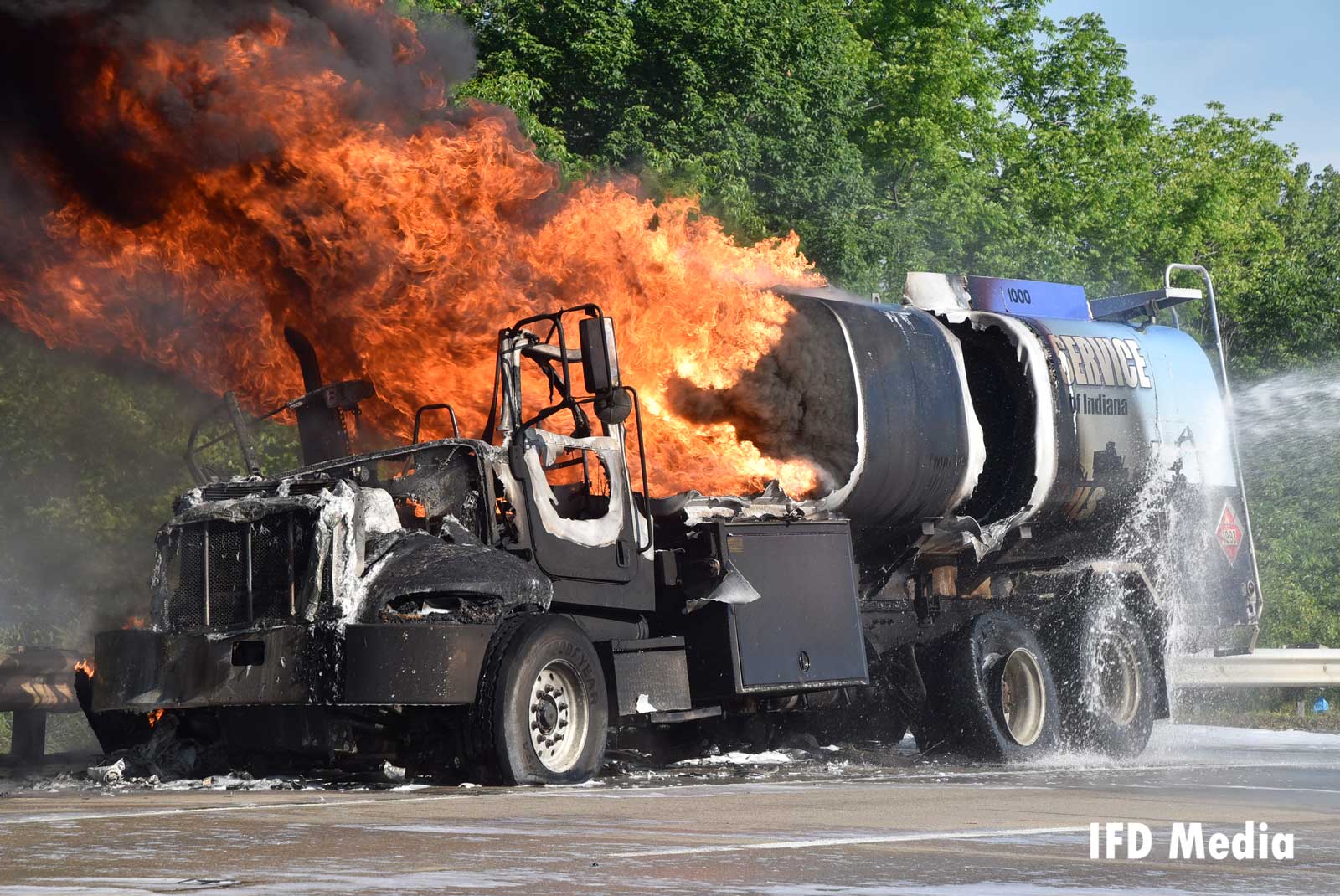 印第安纳波利斯消防局船员于6月6日星期六回应火灾,使用水和冷却剂泡沫的组合来在3,000加仑的油轮中熄灭火灾。卡车的司机没有伤害,告诉消防员,他认为驱动轴松动并在坦克中打了一个洞。他听到了一声巨响,拉过来,跳出了卡车。
