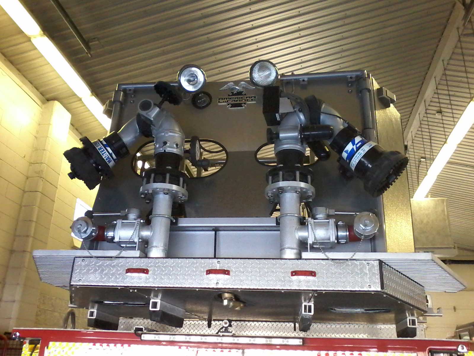 有些天线装置只有一个喷嘴,有些则有两个喷嘴。选择一个光滑的喷嘴或一个组合喷嘴是由消防部门的操作和他们如何认为最好的方式送水。正如你在照片1中看到的,一个单孔光滑的喷嘴位于平台的正中间,而在照片2中,我们有两个组合喷嘴位于平台的两侧。如果高空装置是直梯,则只有一个喷嘴位于梯子正中间,如图3所示。