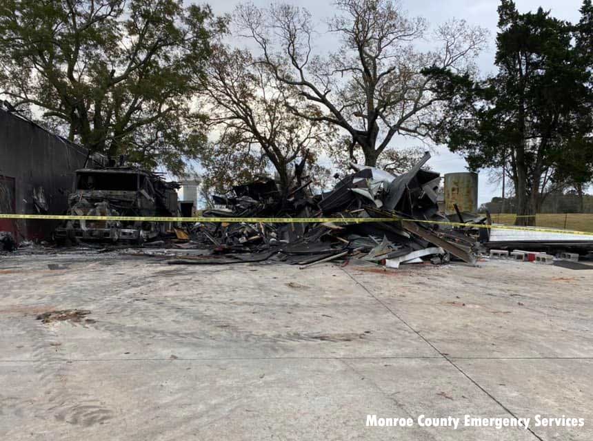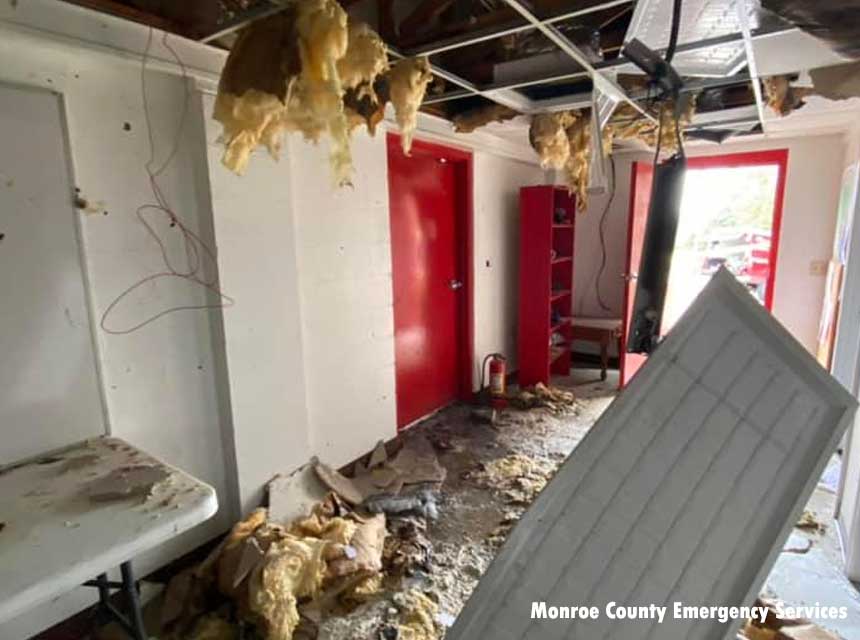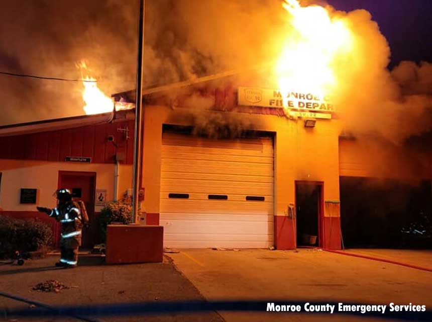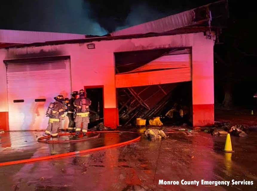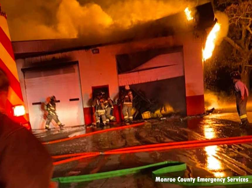 911个呼叫者报告的烟雾在11:04上午10点到10点烟雾。星期六。当梦露县消防员稍后抵达现场时刻,该站已经在火焰中吞没了。由于消防员试图熄灭火,车站的一部分10屋顶坍塌,导致消防员撤退并改变他们的攻击策略。一个消防队员,营队长粘土沃尔顿,在战斗爆发时膝盖受伤,并被运送到当地医院。