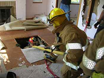 Once crews tried this maneuver, a charged hoseline was brought into the house. Firefighters were sent individually into the basement to try different ways out– a different way out than the first one with a rope loop. A charged hoseline was sent into the hole we had cut into the floor, nozzle-end first. The trapped firefighter was told to try to stand on the end of the nozzle with one foot on the bail and the other on the pistol grip. Holding on, the trapped firefighter told the crew to pull him up to the main floor. It was difficult to maintain balance; several firefighters slipped off the nozzle while training on this move.