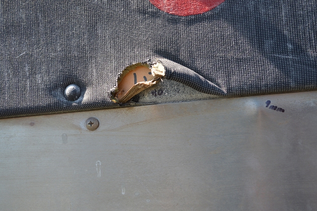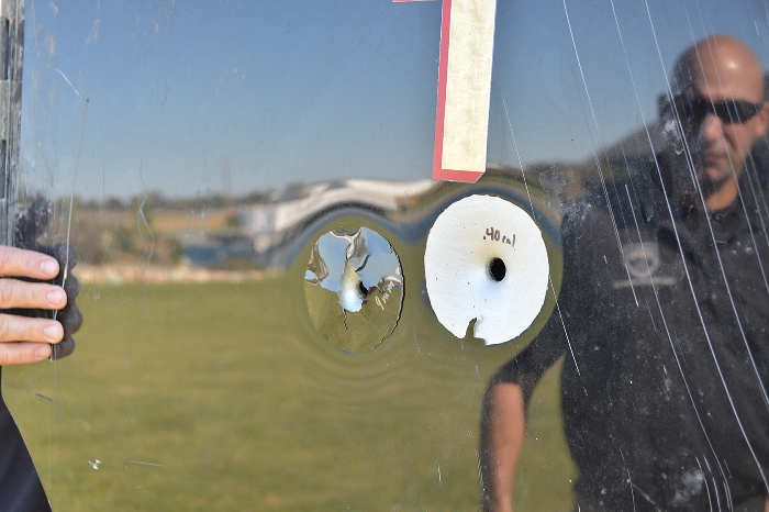 (2)在25英尺外用手枪(9毫米口径和。40口径)第一次射击。两枪都穿透了3/16英寸5052级铝外门皮肤。