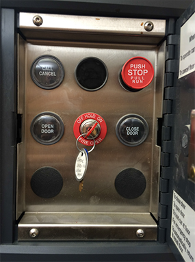 - 第二阶段-消防人员手动使用车辆。此方法与第一阶段相同,但这一次,取下消防钥匙并进入电梯轿厢。接下来,打开消防服务面板,插入钥匙,手动控制汽车。一旦插入和转弯,汽车的操作都是由消防队员在面板上决定的。选择所需楼层,按住“关门”按钮。到达地面后,按住“开门”按钮,直到门打开。注:这些不是瞬时开关,如在正常操作时所注意的;消防系统要求你完全按住这两个按钮才能开门。