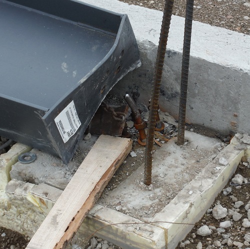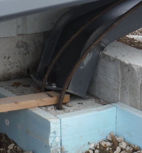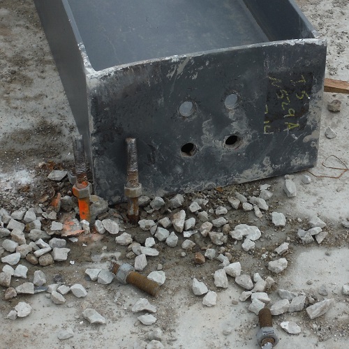Photo 1 shows the base of one of the columns after the collapse. Note that the collapse has bent the two visible anchor bolts, snapped the two on the other side of the column’s web, pushed out the blocking from between the foundation and the column flange, and bent the structural steel column across the top of the concrete foundation wall.