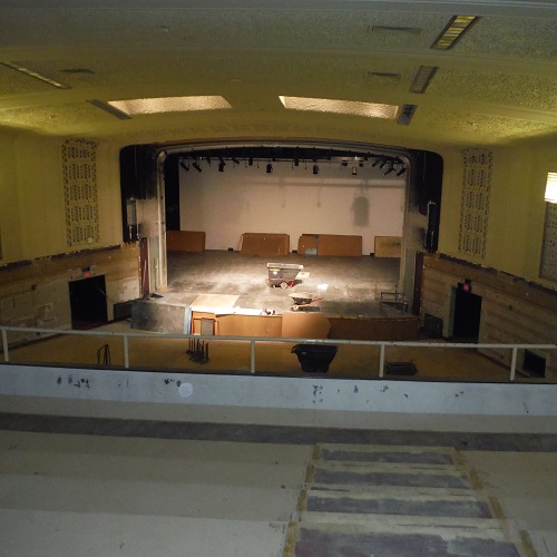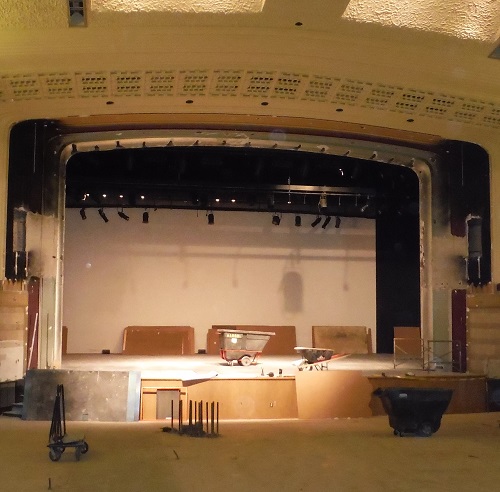 图一为一所中学的礼堂内,设有一个完整的舞台,并设有展览厅,设备齐全,可上演舞台剧。它建于1930年左右,现在正在翻修。主楼层可容纳约700人(如易洛魁剧院),但它只有一个阳台。