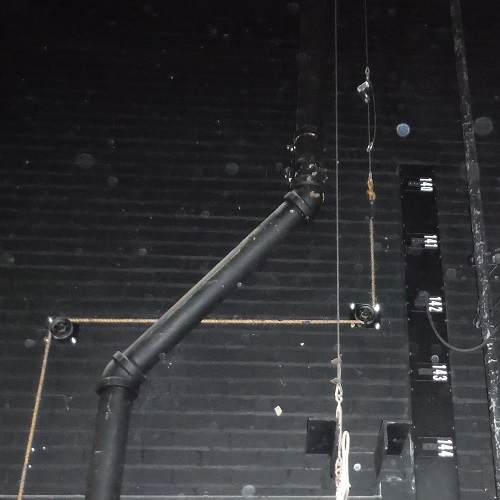 图4显示了手动释放器的另一个视图,以及它与舞台拱顶两侧和顶部的钢缆之间的连接。手动或用熔化的熔丝松开电缆的张力,可以让重力使火幕脱落。