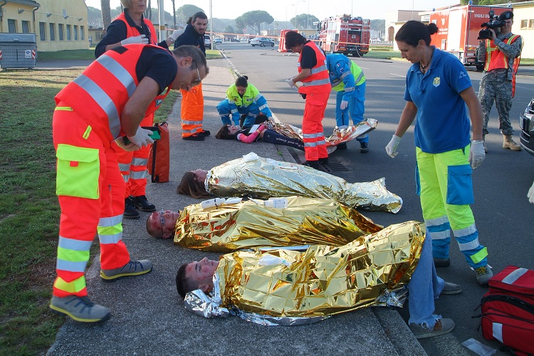 意大利公共援助组织成员(橙色)和天主教协会米塞里科迪亚援助服务组织成员(蓝色)在"托斯卡纳太阳"演习期间对模拟伤亡人员进行治疗,并为将他们送往意大利当地医疗设施做准备。(摄影:Elena Baladelli)