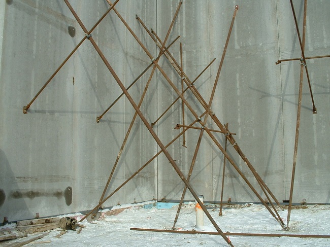 在图2中,一些支撑是用螺栓固定在基础墙上,而不是用锚栓固定在填满混凝土的洞里。图二亦显示由于墙板的高度,墙板与墙撑中点之间的额外支撑,以防止墙撑在风荷载下屈曲。