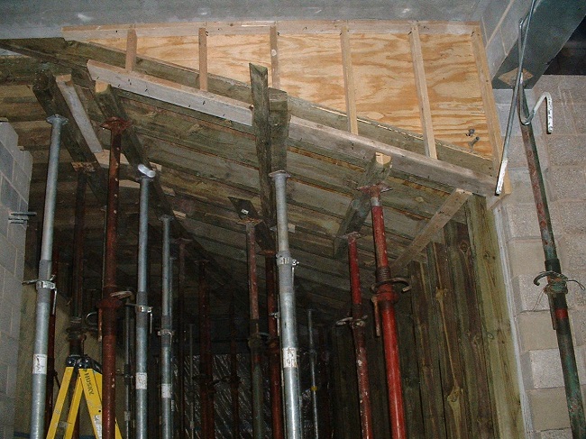 - 中间有螺旋千斤顶的伸缩柱,可以精确调整胶合板的水平。这些柱子有木“X”支撑,以加强柱子的高度。