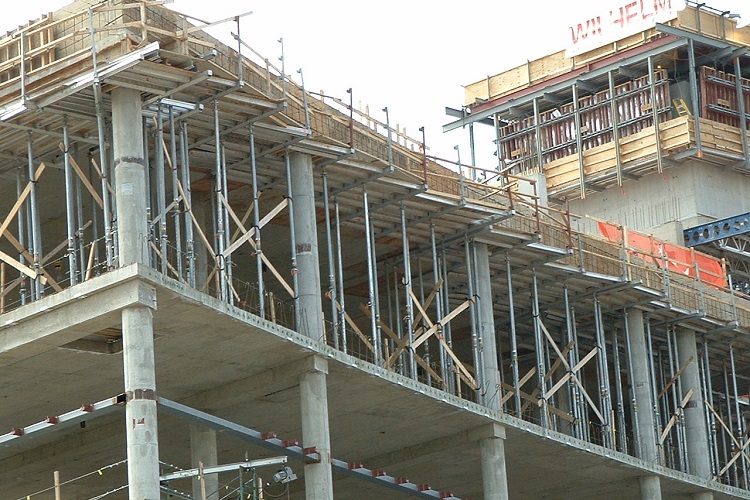图5为一家酒店的临时结构,该结构支撑着胶合板形式的后张混凝土地板。