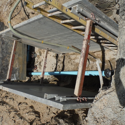 两块钢板由方管支柱隔开,其长度可根据沟槽的宽度进行调整。虽然管道铺设时沟渠有些阻塞,但这是为了这个项目工人的安全而做出的合理权衡。由于这种支撑方法在坑道底部的安全工作区域有限,所以在挖沟和铺管过程中,检查员必须一直在现场。敷设管道时,挖土机将沟槽箱向前拉,在沟槽后面回填已完成管道的沟槽。