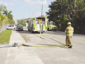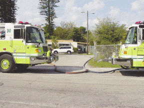 ![]() 第二个到达的发动机把它的五英寸歧管与第一个发动机的供气管线连接起来,并把它的倒转接头与一个消火栓连接起来。 |