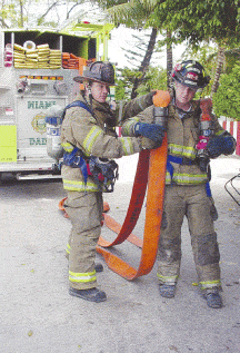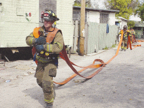 作为一个实际的问题,每个消防队员可以把21/2英寸或3英寸的软管拉长100英尺,因为软管可能会碰到角落和障碍物。此外,大城市以外的发动机设备往往有很大的增压罐,因此,软管床非常高。对于消防员来说,进入软管床并抓住软管碎片是非常困难和危险的。此外,许多消防部门不会将他们的2 /2英寸或3英寸长的消防水管布置成“末端”,也就是说,200到300英尺长的软管形成折叠或马蹄形,可以很容易地拉起来,放在消防队员的肩膀上,并向火灾方向伸展。当然,你可能只需要抓住软管的末端,把它拖向火。当拉伸很短且呈直线时,这种方法会起作用,但这种情况很少发生。