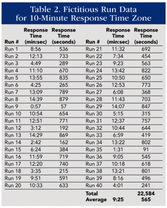 分析时间研究(响应时间,调度/呼叫处理,投票率,旅行时间),然而,使用百分位/分位数方法。大多数标准参考90%到95%。与平均水平相比,使用百分位/分位数目标或标准通常需要更高的服务水平。这种差异的一个很好的例子是使用一组数据来说明相同响应时间数据的平均值和90 /95百分位。根据分析数据的方法,几乎有8分钟的差异。