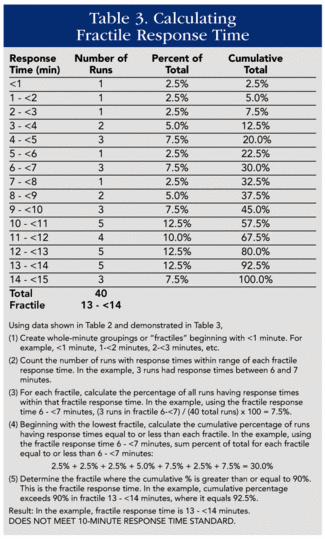 火灾信息管理系统通常使用平均而不是百分位/分位数。然而,有知识的信息技术(IT)部门可以从这些时间数据(信息字段)系统中编译列表,或者编写例程将数据分析成有意义的列表。响应时间的列表通常以整分钟的时间框架(1-2分钟,2-3分钟,3-4分钟,等等)完成。对于每个整分钟范围,计算该分钟内的响应数,并计算总响应的百分比。从最低的整分钟范围开始,将累积百分比加在一起,直到至少达到90%(使用第90个百分位数/分位数)。89.50的累积百分比需要使用下一个范围,直到找到90。整分钟范围现在变成了第90百分位/分位数,也就是说,如果3-4分钟范围至少是累积的90分钟,那么性能响应时间小于4分钟,响应时间为第90百分位/分位数。注:表的响应时间为第一台合格设备。
