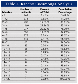 下面的数据分析示例是2004日历年库卡蒙加牧区(Rancho Cucamonga)消防区里的设备到达EMS事故的时间,该数据分析表明,到达EMS事故的时间少于4分钟,占时间的55.18%。第90百分位/分位数的旅行时间小于7分钟。