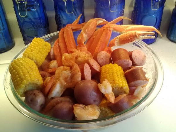 在科罗拉多州的杜兰戈有一家餐厅,供应“卡津煮”;观察新客人用餐时的反应是一件很有趣的事情。服务员先走过去,把桌子上的东西都清理干净,然后把一张涂了蜡的大纸放在桌子上。接着,第二个服务员拿着一个大金属碗来到餐桌上,然后把煮熟的蟹汤倒在桌子中央。客人们被告知这顿饭是“人人为我,人人为所有人”。我第一次吃的时候就爱上了这顿饭,并开始制作我自己的食谱。这是我最终开发的。比起原来的配方,我更喜欢烟熏辣椒粉的味道。我还把克里奥尔调味料放在桌子上,这样人们就可以添加更多的调味料,增加他们心中的滋味。我希望你能像我的家人和船员一样享受这顿饭。