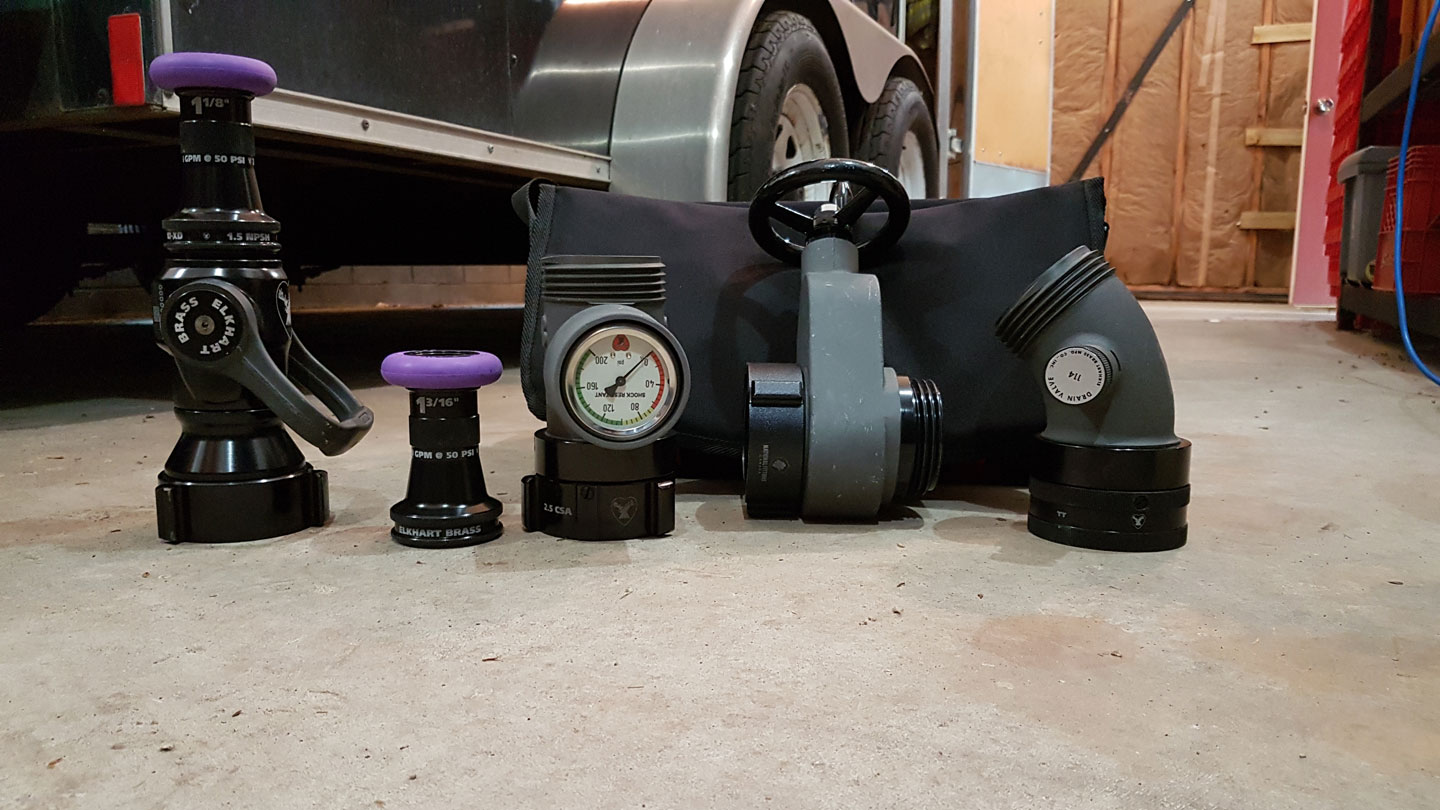 有一个备用的两个尖端也有利于立管工具包。根据部门的流量要求,它们可以有一个1 1/8或1 3/16英寸大小的喷嘴或固定流量组合喷嘴。如果如图所示,软管的喷嘴为球形阀,则无需关闭管道即可轻松更换喷嘴,可以更换更大或更小的光滑孔喷嘴,也可以添加固定流量的组合喷嘴。