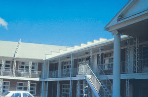 ▲This impressive-looking parapeted fire wall may be ineffective if it is compromised in any way. Check for openings of any kind; even an opening for a single wire can pass fire. The laundry rooms were in the basement. Tenants chocked fire doors open for convenience; fire extended to three units.