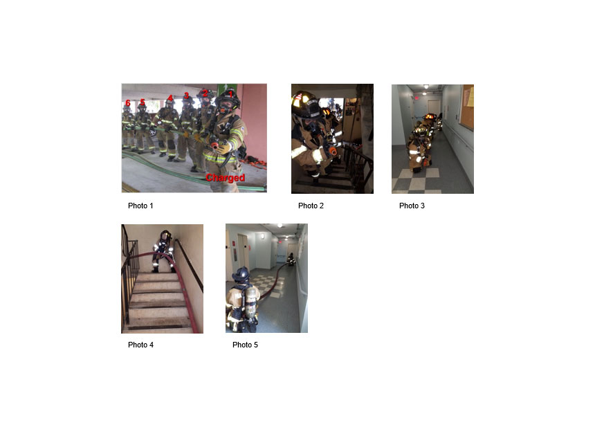 那么我们如何考虑沿着袜子距离间隔开的人员?当多个公司在一起工作时,忘记记住人员的名字。过去的一种方法,过去的无数次工作是将所有公司排队在喷嘴位置后面的袜子上,并将每个成员倒计,从排出的喷嘴位置开始(照片1).当软管水平拉伸时,这种方法适用于水平拉伸,如办公室套件,或垂直上楼梯。(照片2.).试想一场公寓火灾。1 2 3号位置是喷嘴组。位置1为喷嘴,位置2为公司负责人,位置3将最终定位在通往消防隔间的门上。(照片3.)现在考虑软管在通过电梯大厅时必须进行两个转弯:如果是这种情况,那么位置4将在第一个拐角处停止,并将软管馈送到位于下一个拐角处的位置3。(照片4.)在这种情况下,第5位将停在楼梯间的落地着陆和楼梯间的位置6。(照片5.)剩下的位置将在火下方的地板上运行,喂养软管上楼梯和监测,如果是一个竖管操作,监控和调节出口阀压力。
