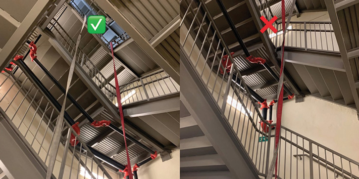 在井眼拉伸过程中,有一件事需要注意。如果第二根绳子和第一根绳子伸展的方式一样,当消防员上升时,第二根绳子将围绕第一根绳子呈螺旋状。为了避免这种情况,伸展第二根绳子的消防队员应该在井孔中滑动橡皮绳,只需要把喷嘴拿上去。当他们到达每个楼梯平台时,带着喷嘴的消防队员将喷嘴绕在第一条绳索上。这将防止扭转,并在提升时消除任何问题。在井眼拉伸过程中,选择好地板后,将软管固定在栏杆顶部也是非常重要的。我的装备里有一小块带钩的带子,我用它来做许多事情;这就是其中之一。