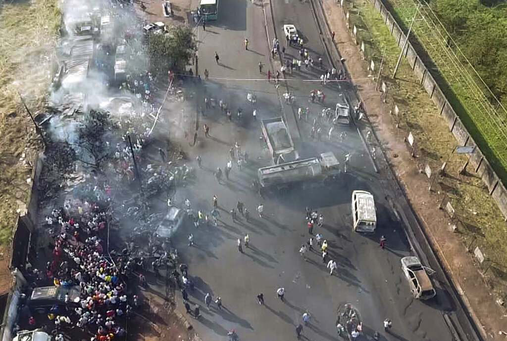 美联社获得的爆炸后的视频显示,一个巨大的火球在夜空中燃烧,一些严重烧伤的幸存者痛苦地喊叫。烧焦的尸体散落在现场,等待运往停尸房。