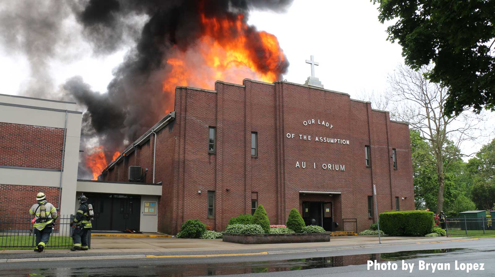 On June 3, 2020, at approximately 2:40 p.m., the Copiague (NY) Fire Department was activated for a reported structure fire at Our Lady Of Assumption Church on Molloy Street. Fire-rescue dispatch was receiving numerous calls for a reported fire at this location.