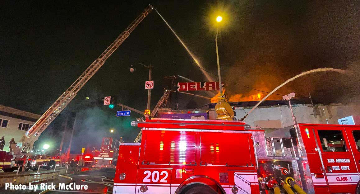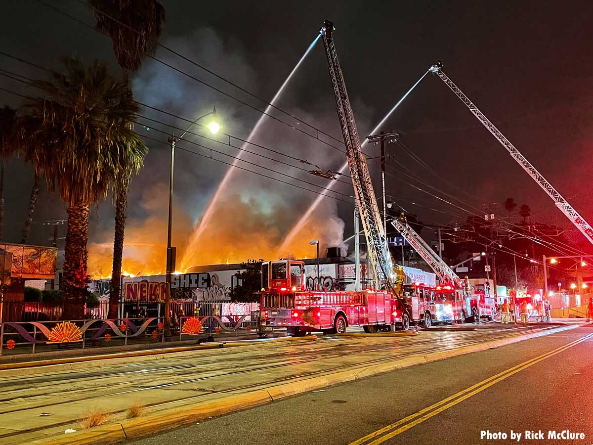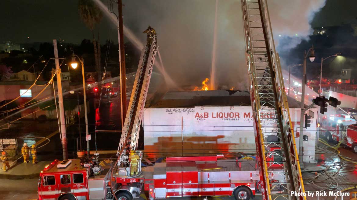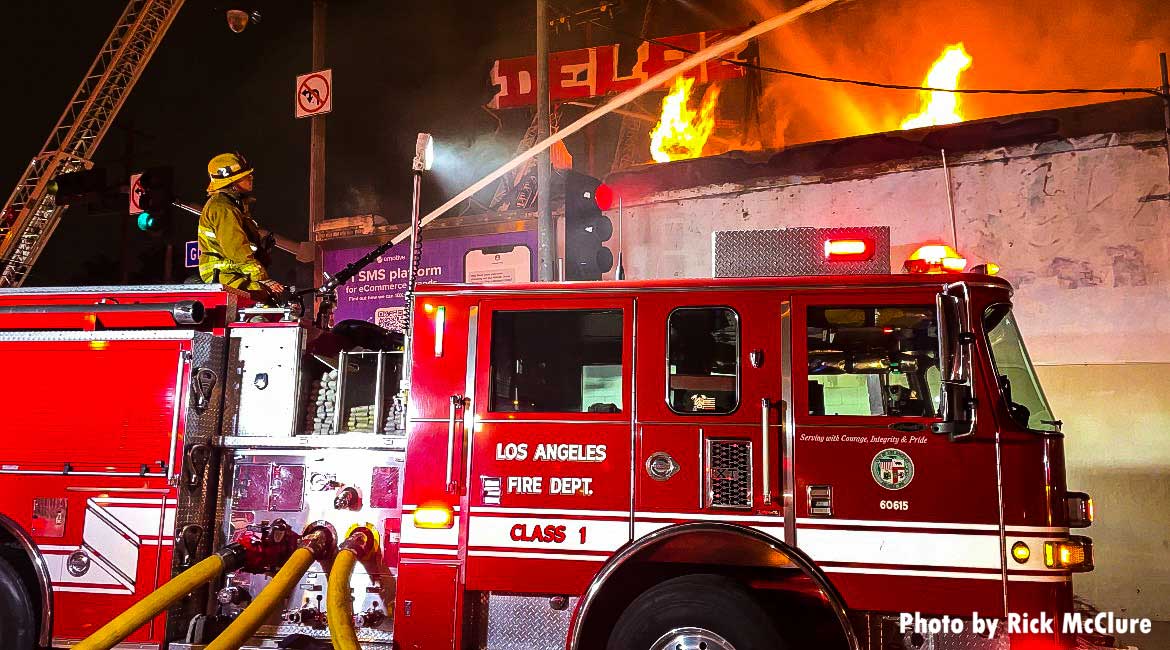 LAFD CREWS下午11:39回应。2021年9月27日,在一个故事的商业建筑物中火,大约50 x 100英尺,在至少一侧出现大火。