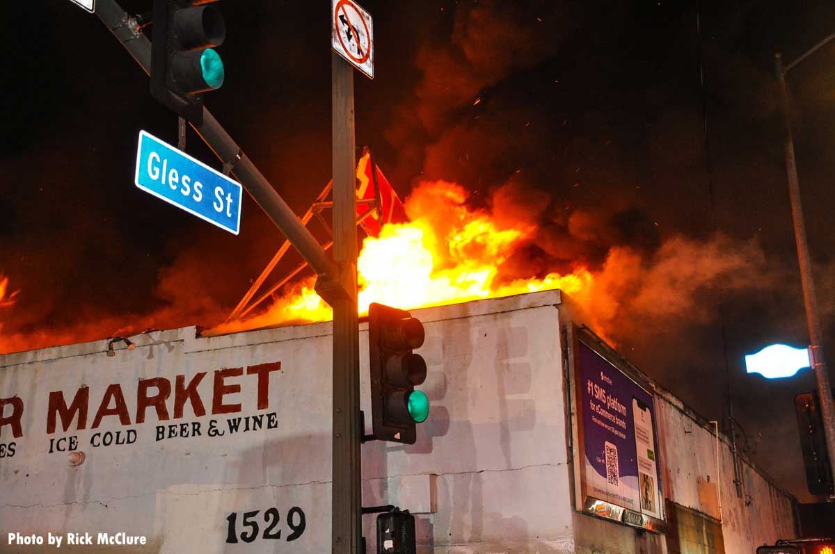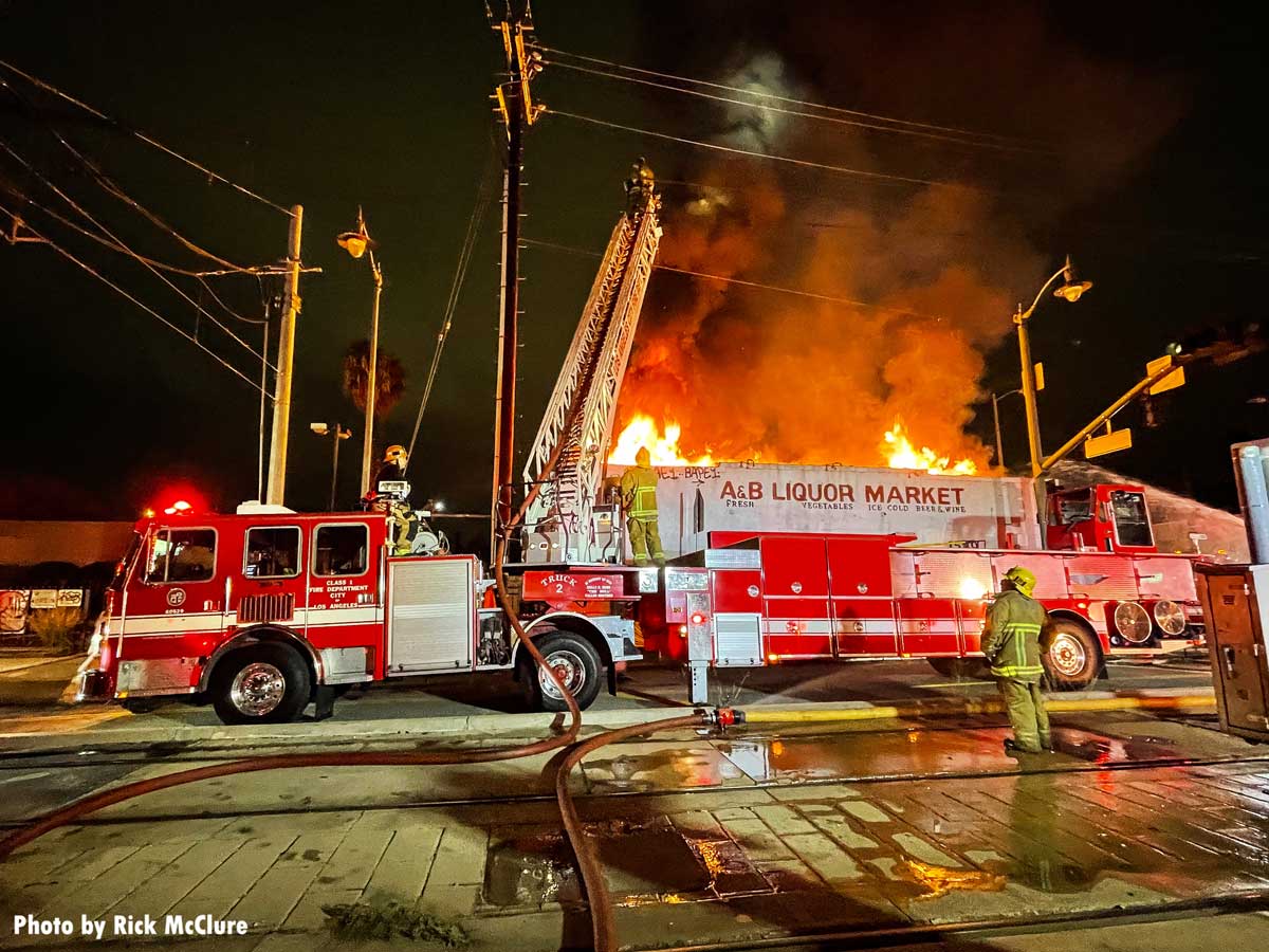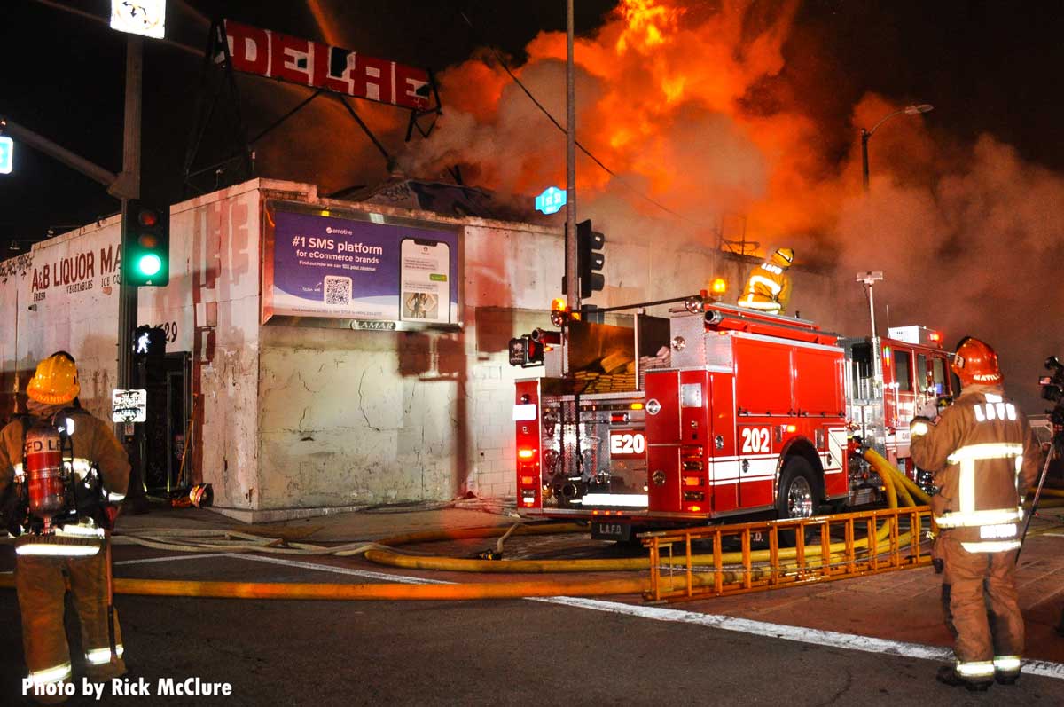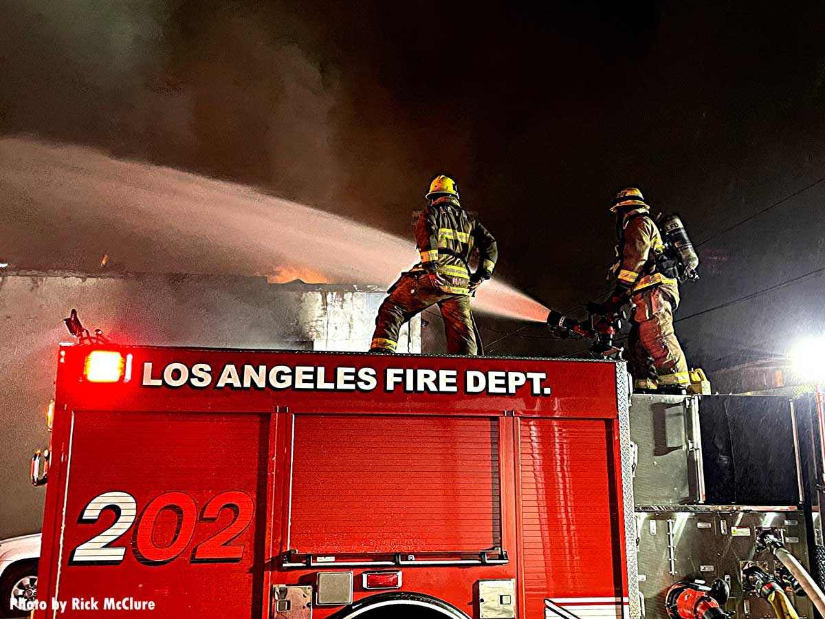 LAFD CREWS下午11:39回应。2021年9月27日,在一个故事的商业建筑物中火,大约50 x 100英尺,在至少一侧出现大火。