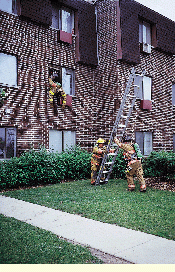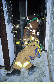 4.搬到安全的地方去。如果可能,将消防员从火灾和倒塌区域中拖出。有时,仅仅将受害者移到几码远的地方,一个不受影响的公寓或房间,一个受保护的楼梯井或楼梯平台,附近一个可以放置地面或塔式梯子的窗户,或一个防火梯或外部出口都可以意味着安全。