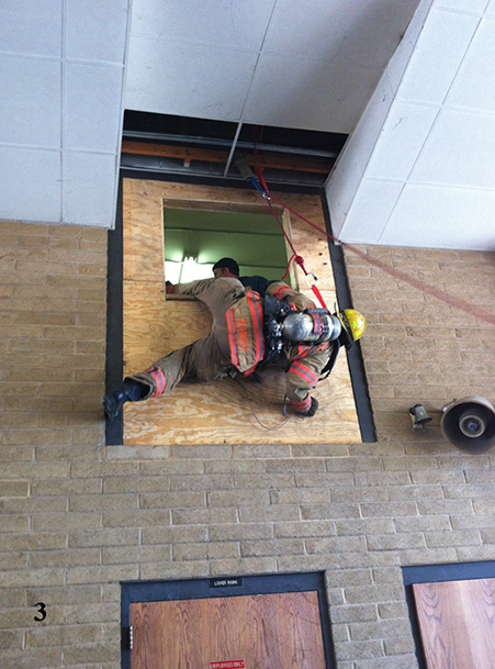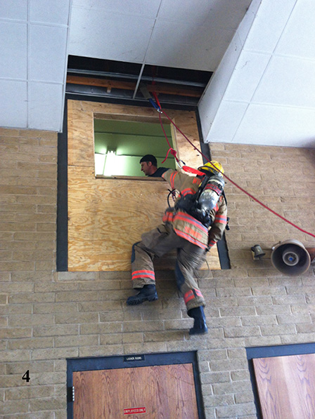 - 在这一点上,你应该能够跨坐在窗台上,你的左手和左腿保持你紧贴窗台。在这一点上,如果在紧急情况下,没有梯子可以救援,或者你没有PES,你可以抓住梯子,直到梯子上升到你的位置。