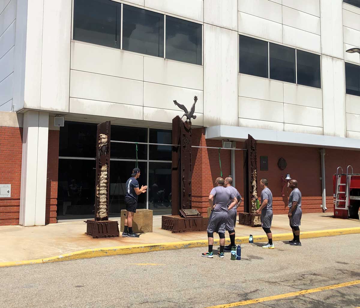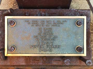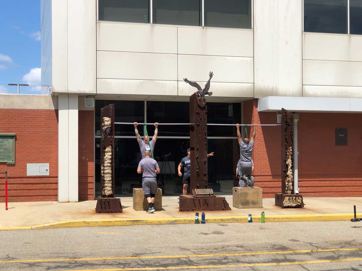这些引体向上的钢条由9·11事件的钢铁制成,提醒人们消防员的工作需要的力量和牺牲。这些酒吧经常在消防学校试用期间使用,并作为对他们所有培训的额外动力。在拉杆的底部有一块铭牌,上面写着:“要骄傲,要勇敢,要坚强,但最重要的是要有准备。”