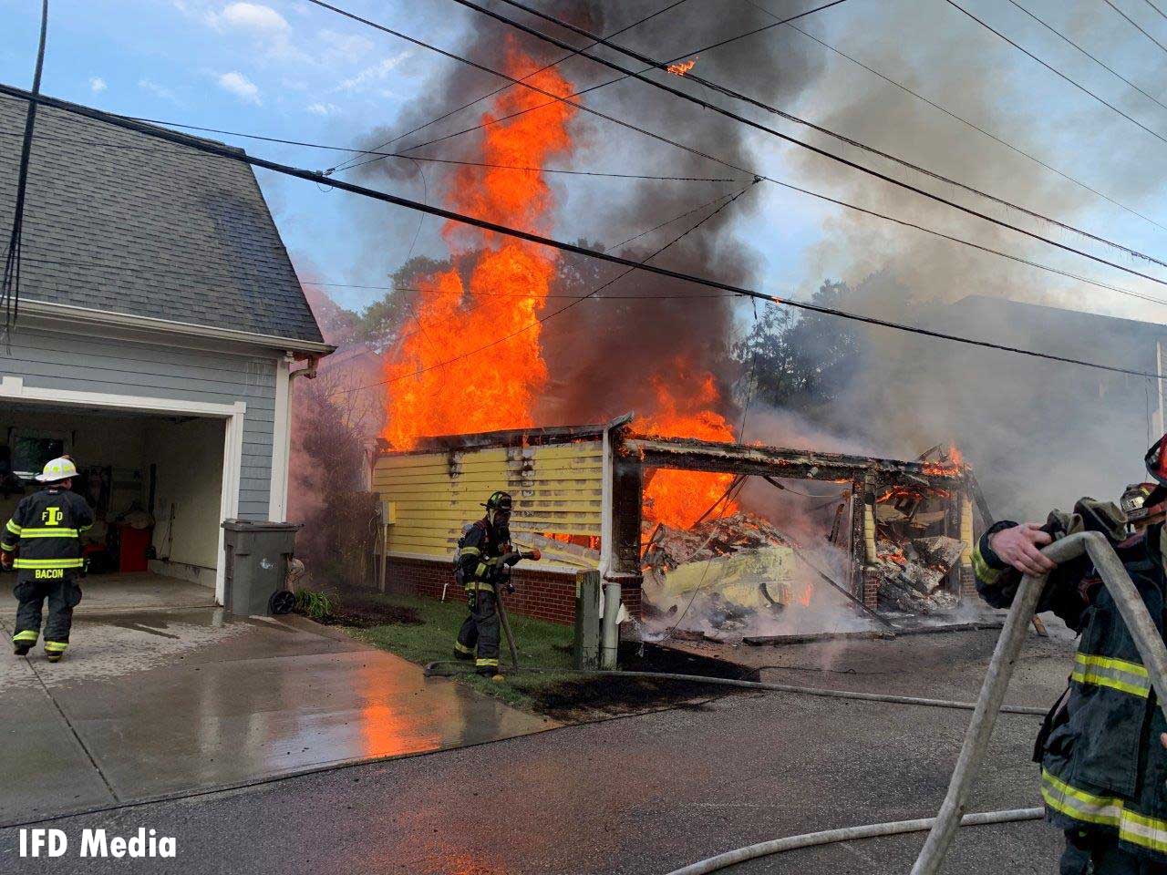 In the photos shared by Battalion Chief Rita Reith above, firefighters worked at the scene of a garage fire with exposure issues. Multiple calls reported an explosion and heavy fire at 1456 Central Avenue in the early evening. Indy firefighters responding to this working structure fire had also to contend with multiple power lines down and on fire. Crews on scene believe the initial blast sound came from tires or possibly a fuel tank on one of the vehicles in the garage, which sustained a partial collapse. Extension of the fire occurred to the detached garages on either side of the main fire with some extension to the homeowner’s pergola and the rear eaves of his house.