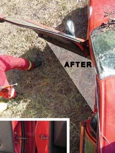 如果汽车碰撞的大多数受害者仍能正常工作,则通过离患者最近的车门将其带离车辆;如果没有,门将被完全移除。如果这扇门还能开,而且这个开口是逃生的首选路径,那么救援者可以通过超伸门来创造几英寸的额外空间。不要试图强行把门关上;相反,把门框剪开,使门开得更大(图7、8插图)。使用断线钳,这项技术只需要几秒钟;如果门打开了,进入门的检查不是一个问题。这一策略也可以用在类似的方式,当实现侧去除和时间不允许完全去除(图7,8)。