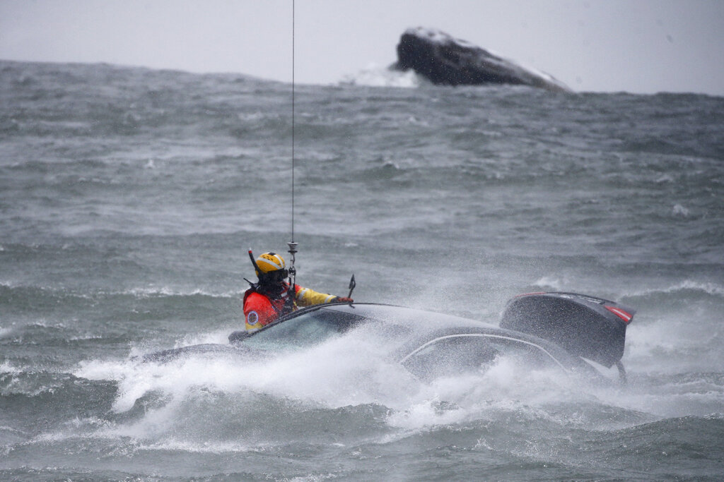 旁观者拍摄的照片和视频显示,下午早些时候,通过白浪,这辆车几乎完全被淹没,只有部分车顶和打开的后备箱舱口可见。