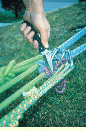 在救援情况下,任何时候用刀割断绳子,都必须非常小心地使用。当然,目标必须明确;但其他的绳子也必须完全透明或保护。用你戴着手套的手护住目标后面的绳子是一种选择。结果你切得更仔细了。也可以使用绳索边缘保护装置。切割的方向也必须确保不可能与其他绳索接触。最简单、可能也是最安全的补救方法是,在使用绳索以保障生命安全的情况下,避免使用刀具。创伤剪或“便士切割机”是刀具的优秀替代品。他们肯定会切断任何用于高角度救援的绳索,而且控制更安全。