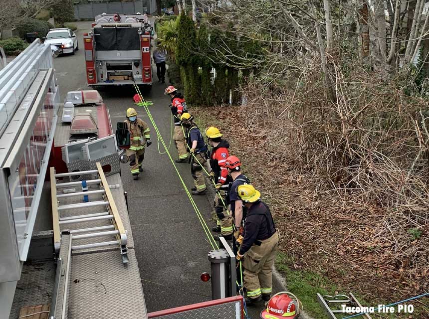 塔科马消防局官员在下午4:15在Twitter上报告了这一事件。船员在瓦索公园以西的一条住宅路北马里纳拉街(North Marinera Street)的6600街区进行了低角度的绳索救援。