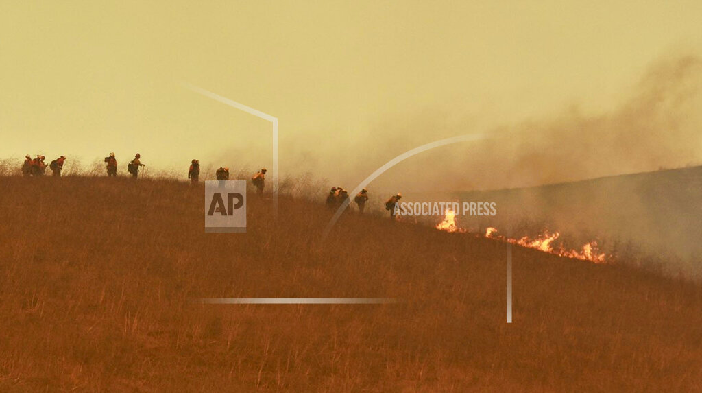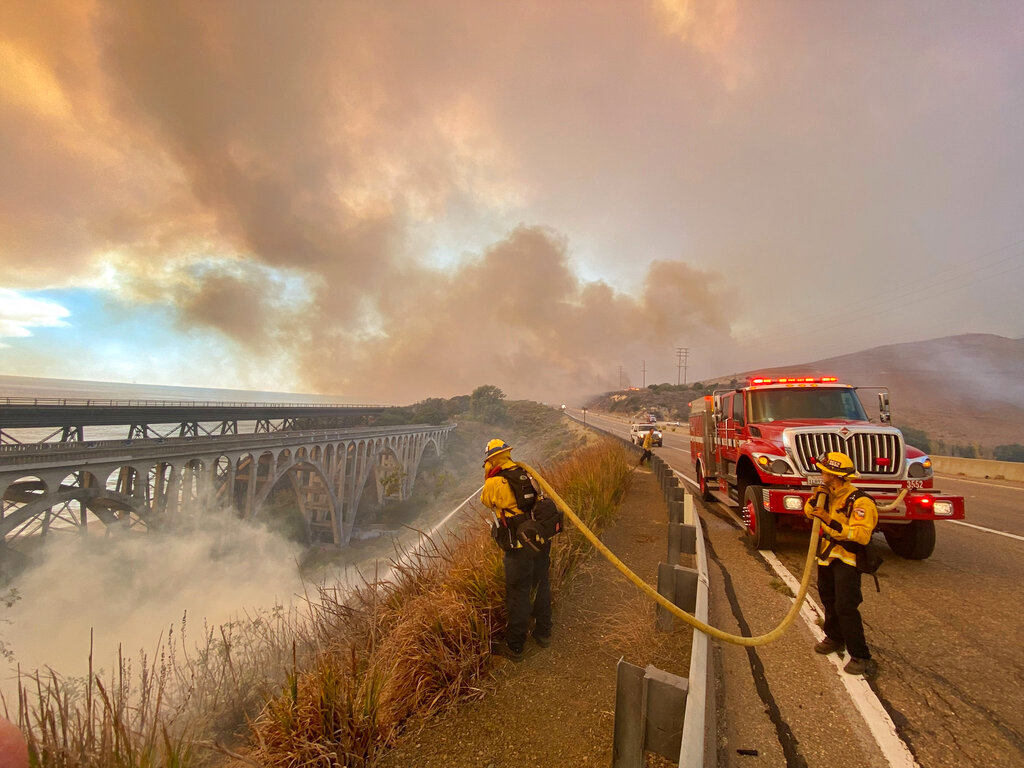 在圣巴巴拉县消防部门提供的这张照片,消防队员扑灭火焰周二下午,2021年10月12日,提前发现了火面前沿着101号公路南行Vista,北Refugio州的海滩在圣巴巴拉县,加利福尼亚州(Mike Eliason /圣巴巴拉县消防部门通过美联社) -