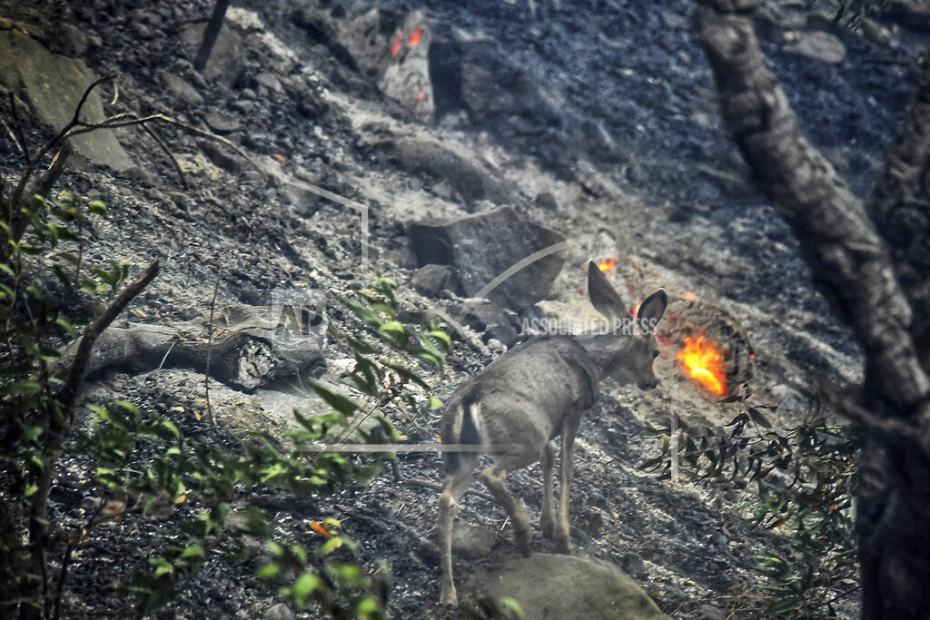 在圣巴巴拉县消防部门提供的这张照片中,一只鹿在加利福尼亚州戈莱塔市雷夫吉奥路附近最近被烧毁的区域附近奔跑,摄于2021年10月12日,周二。(美联社Mike Eliason/圣巴巴拉县消防局报道)