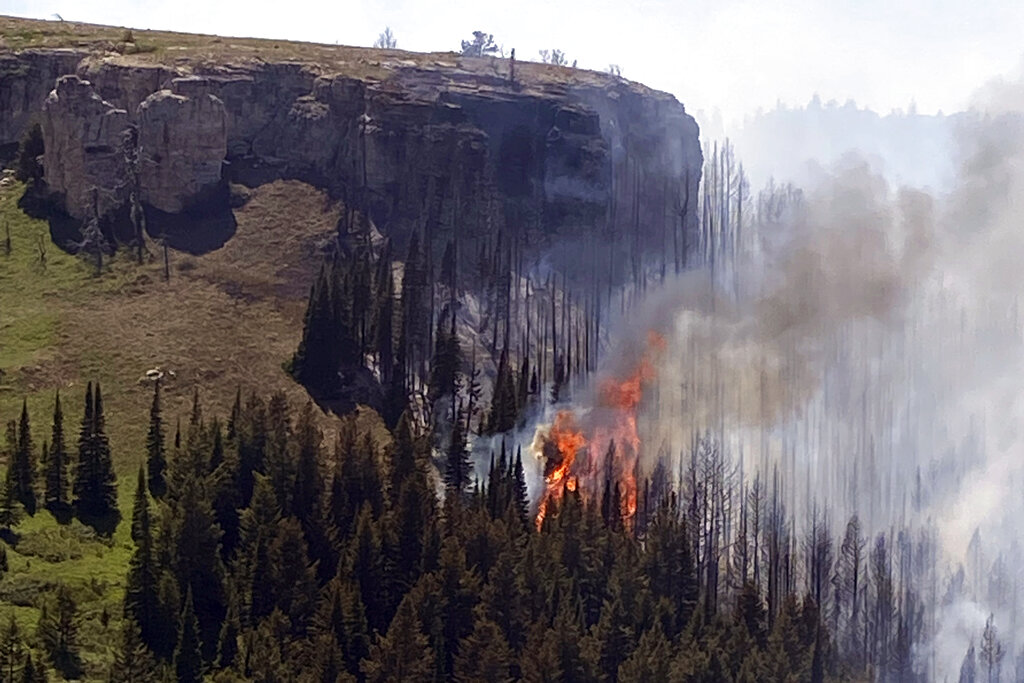 在克罗保留地,官员报告蒙大拿和怀俄明边境附近的大角山发生了新的火灾。大火在陡峭的小公牛麋鹿峡谷燃烧,火焰高达150英尺(46米),有蔓延的危险,官员说。
